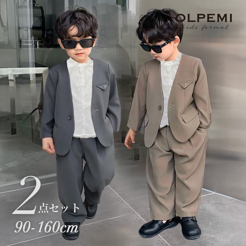 【送料無料】2点セットノーカラースーツ【F040】ベージュ- 100cm