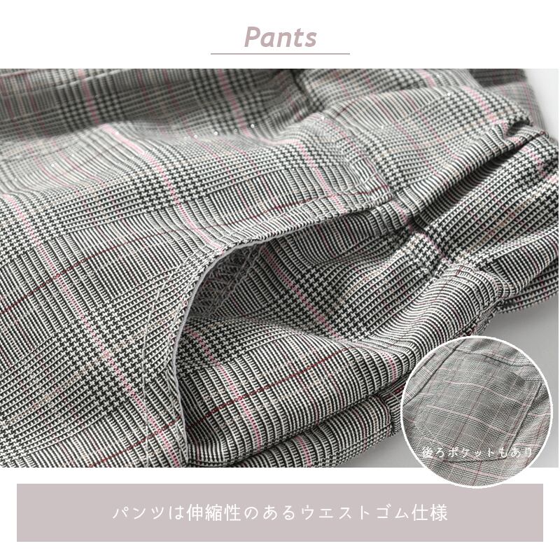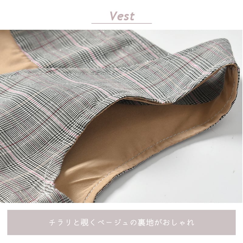 ほんのりラメラインが入ったグレー×ピンクのグレンチェック柄ベスト&ズボン。